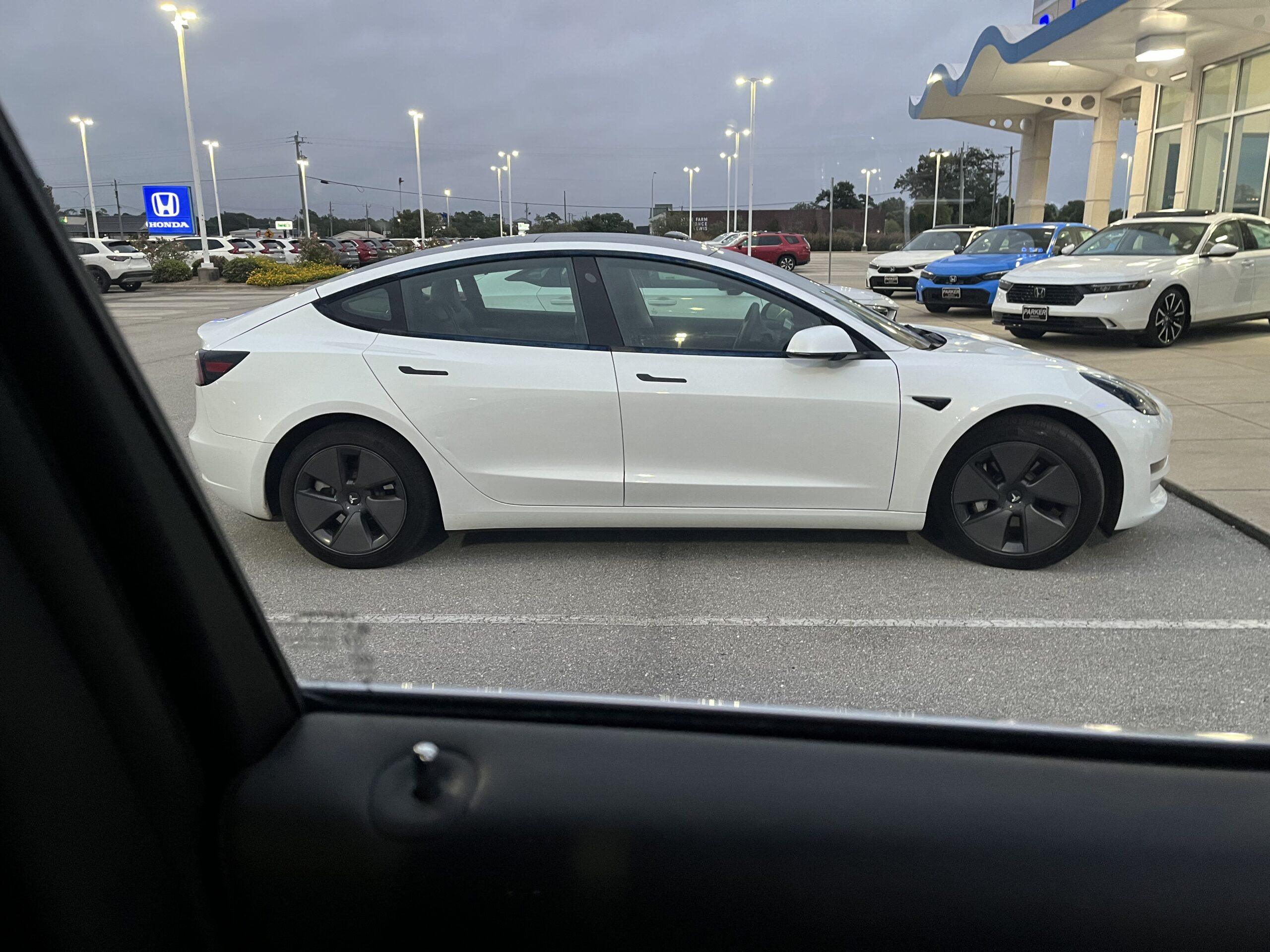 Saying goodbye to the Tesla from the window of my new Jeep.